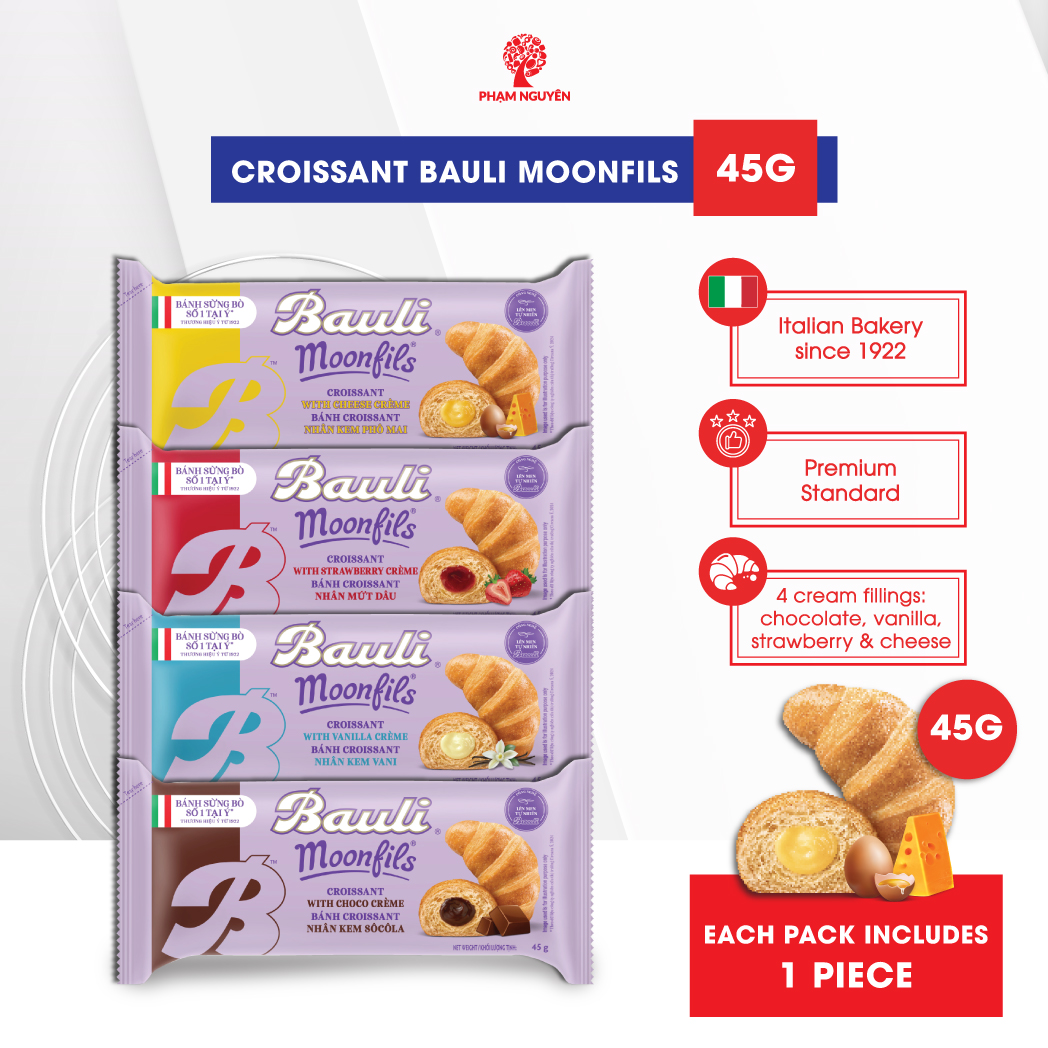 Bauli Moonfils Cheese Crème 45g in convenient small package with crispy, multi-layered crust, flattered by cheese fillings combined with nutritious FRESH EGGS, and delicious butter filling your mouth, providing a source of energy Protein for an active breakfast.