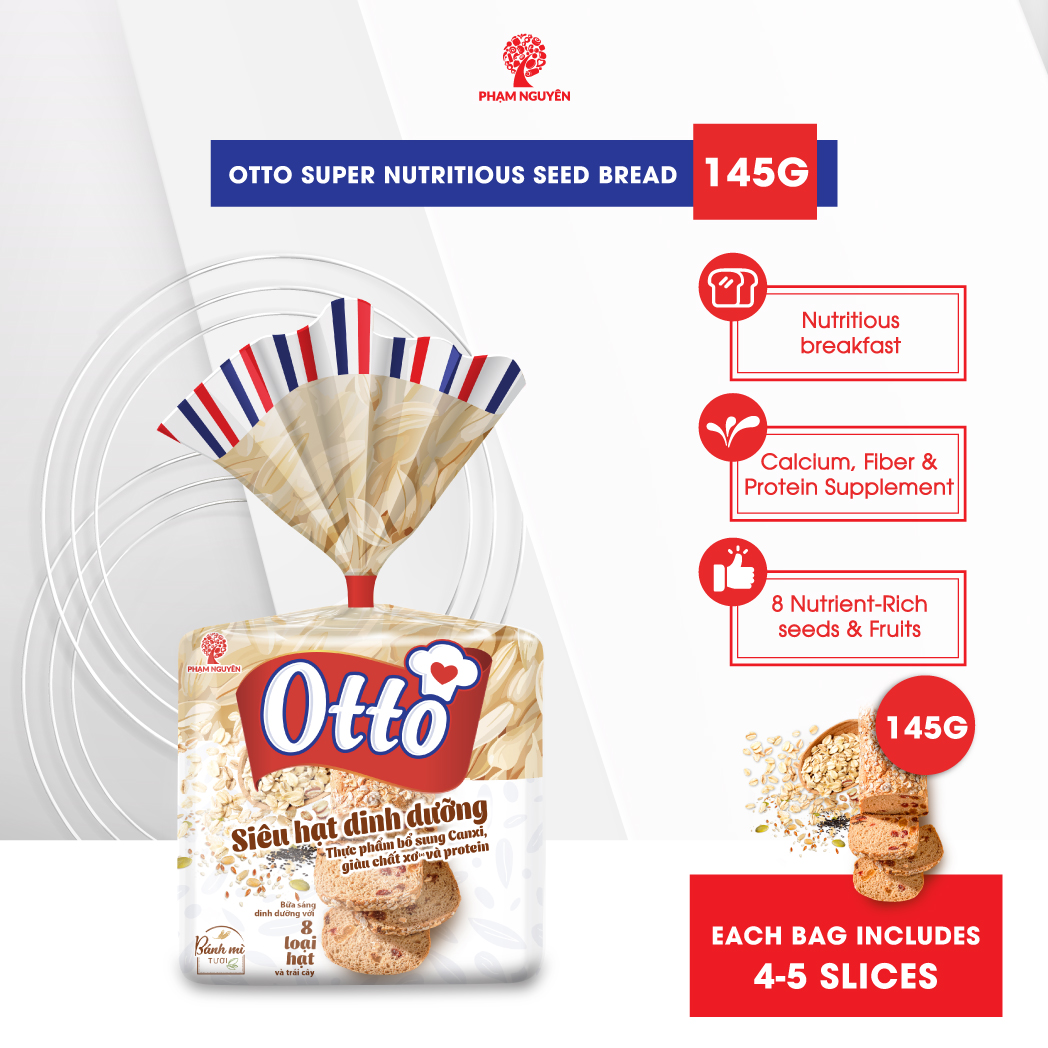 Bạn đang cần tìm bữa sáng dinh dưỡng, tốt cho sức khỏe. Bánh mì siêu hạt dinh dưỡng Otto đem đến cho bạn bữa sáng dinh dưỡng với sự kết hợp 8 loại hạt & trái cây giàu dưỡng chất được lựa kỹ lưỡng để đảm bảo chất lượng cao, sạch & an toàn: Hạt yến mạch, Hạt nảy mầm, Hạt chia, Nam việt quất, Hạt dưa, Hạt mè, Hạt lanh, Nho khô.